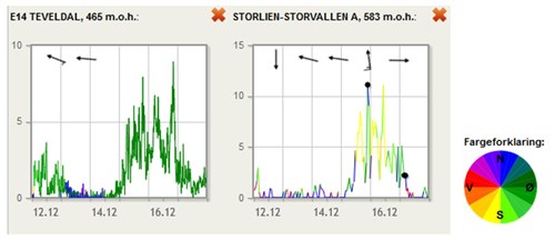 Fig 1: To vindstasjoner ikke langt fra hendelsesstedet, viser at vindøkningen kom allerede den 15.des og fortsatte ut 16.des. Vindretningen var Ø-SØ. Skalaen viser m/s. Vindstyrke 7-10 m/s.