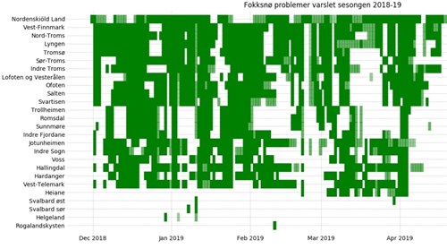 Vinteren 2018/2019: Figuren over viser regionsoversikt over dager det var varslet skredproblem fokksnø på varsom.no