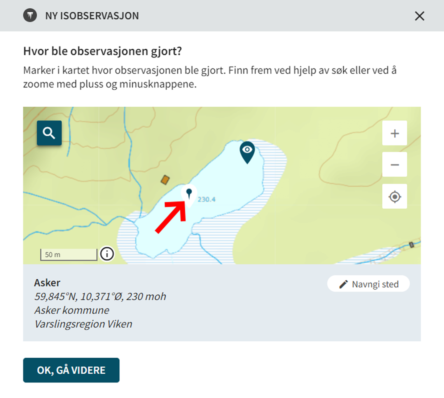 Dersom man bare vil endre posisjonen på det nåværende målestedet, så er det bare å klikke i kartet på den korrekte posisjonen. Symbolet flytter seg da dit, og du avslutter med "OK, GÅ VIDERE".