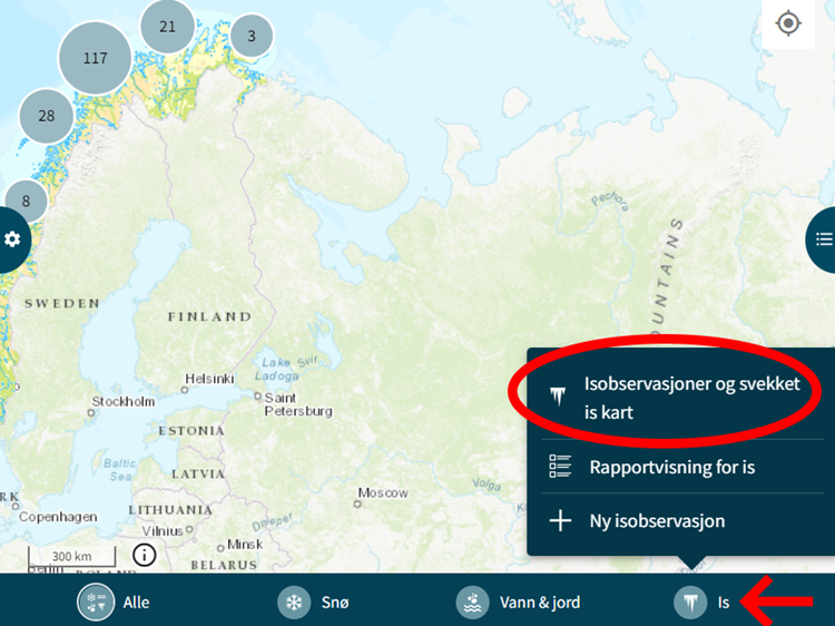 Utseende på Regobs.no vil avhenge av størrelsen på vinduet ditt. Du starter lagringen av en isobservasjon under temaet "Is". Velg så "Isobservasjoner og svekket is kart".