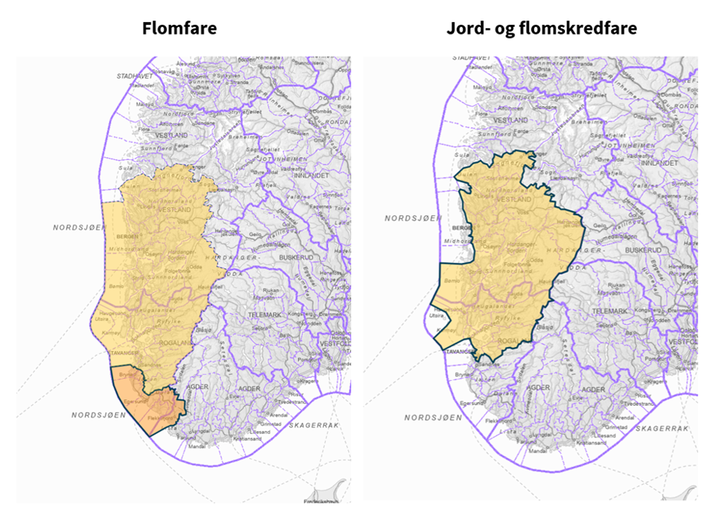 NVE har også sendt ut varsel om jord- og flomskredfare på gult nivå for deler av Vestland og Rogaland.
