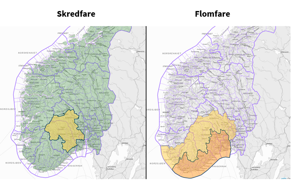 NVE oppjusterer farevarselet for flom til oransje nivå for lavereliggende områder på Sør- og Østlandet fra Agder til sør i Buskerud. Varselet gjelder fra og med natt til lørdag. Det varsles også fare for flom på gult nivå for større områder av Sør-Norge. I tillegg utvides det gule varselet for jord- og flomskredfare til å dekke deler av Buskerud og Vestfold, i tillegg til store deler av Telemark.