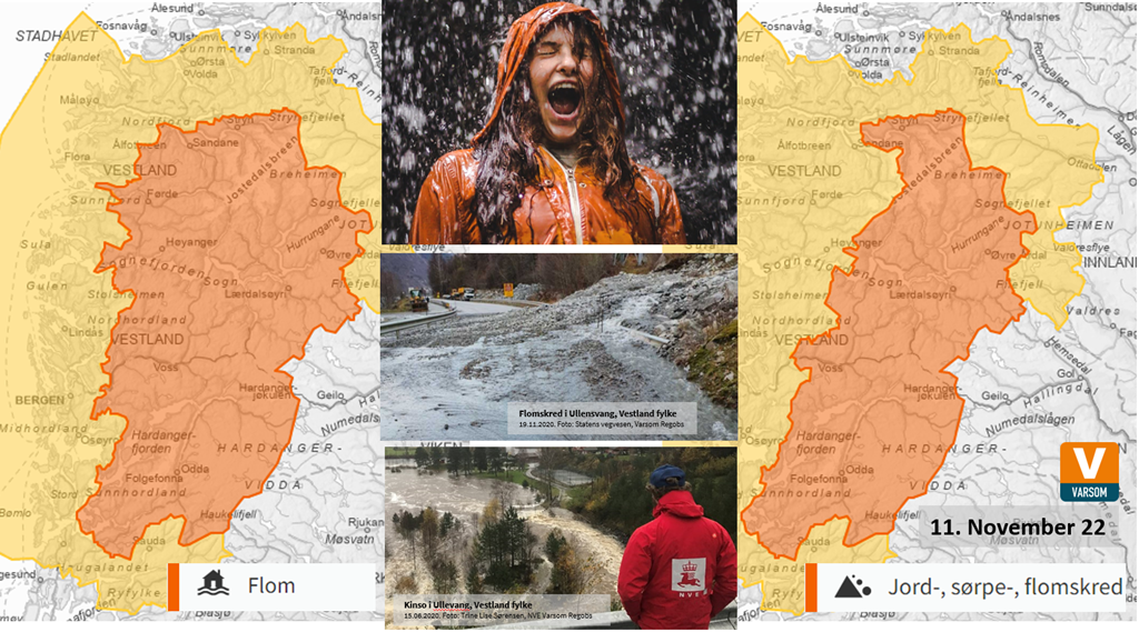 NVE har torsdag formiddag sendt ut farevarsel for jord-, sørpe og flomskred på oransje nivå for indre deler av Vestland fylke på grunn av mye regn torsdag og fredag. For ytre strøk er farenivået vurdert til å være lavere, her er det sendt ut et gult farevarsel. Det ventes mye nedbør over store områder fra torsdag kveld til fredag kveld. Relativt høye temperaturer også høyt til fjells vil føre til snøsmelting. Kombinert med mye regn vil dette kunne gi fare for at det utløses sørpeskred. Sørpeskred kan løses ut i relativt slake hellinger der vann samles opp. Skredene kanaliseres ofte ned forsenkninger og bekkeløp og kan da utvikle seg til flomskred.