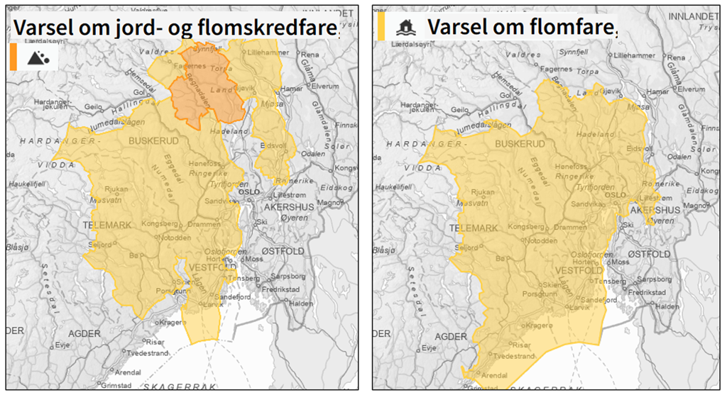 Oransje og gult farenivå for jordskred og flom for deler av Østlandet