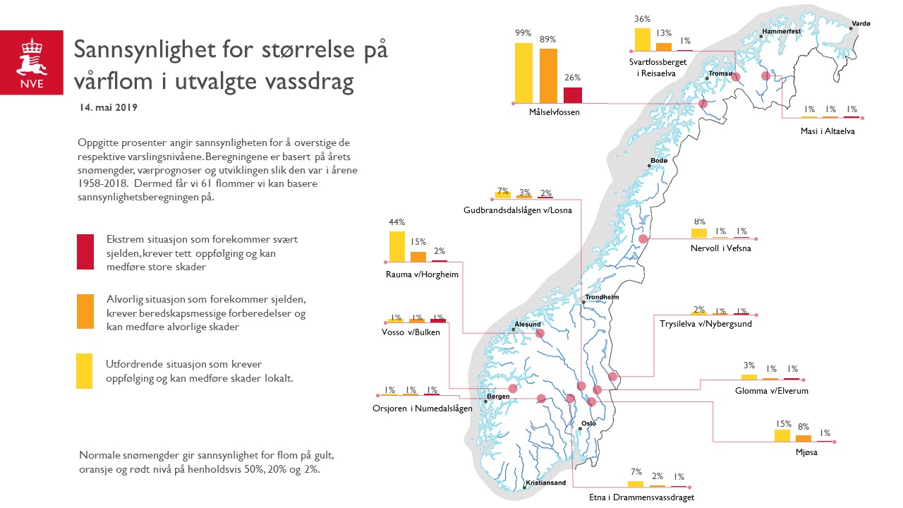 - I Troms, nord i Nordland og på ytre strøk sør-vest i Finnmark er det fortsatt så mye snø at det på det meste er omkring 80% sannsynlighet for stor vårflom. Med stor vårflom menes flom på oransje nivå. Det vil si en flom som kan medføre alvorlige skader og som forekommer sjelden, forklarer Engen. Det vil alltid være en sannsynlighet for flom på rødt nivå, men våre beregninger viser at denne sannsynligheten også i år er liten, med unntak av Målselvvassdraget i Troms, som vi følger ekstra nøye med på i år.