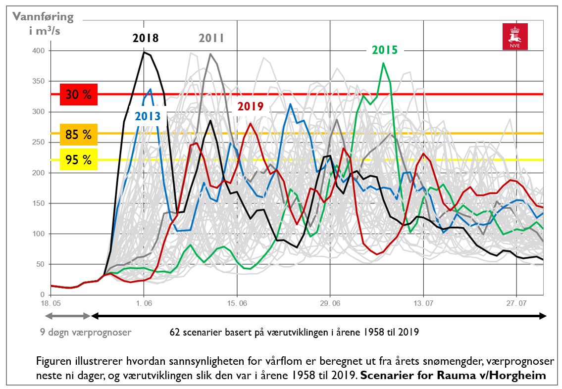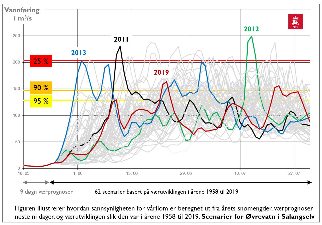 Figuren illustrerer hvordan sannsynligheten for stor vårflom er beregnet ut fra årets snømengder, værprognoser neste ni dager, og værutviklingen slik den var i årene 1958-2019.