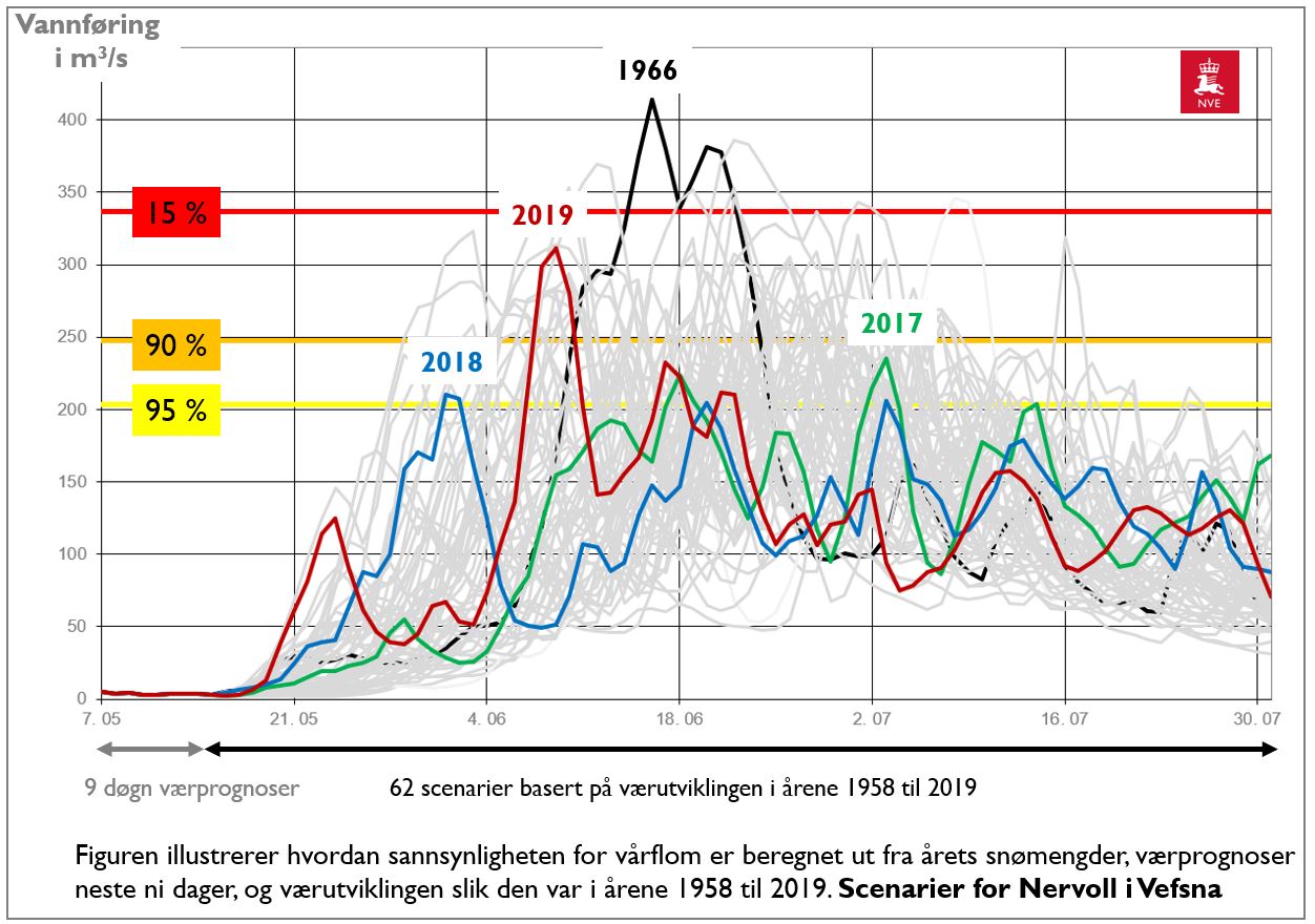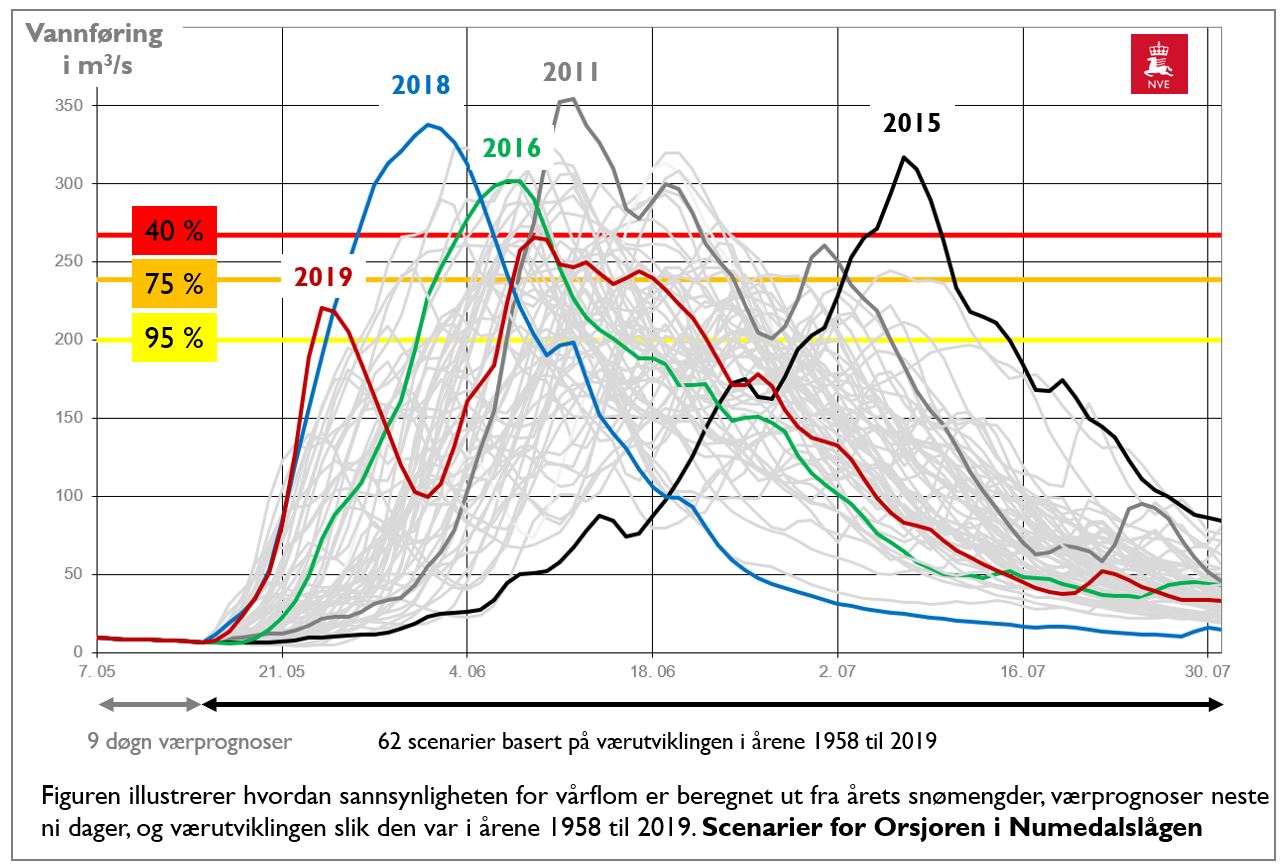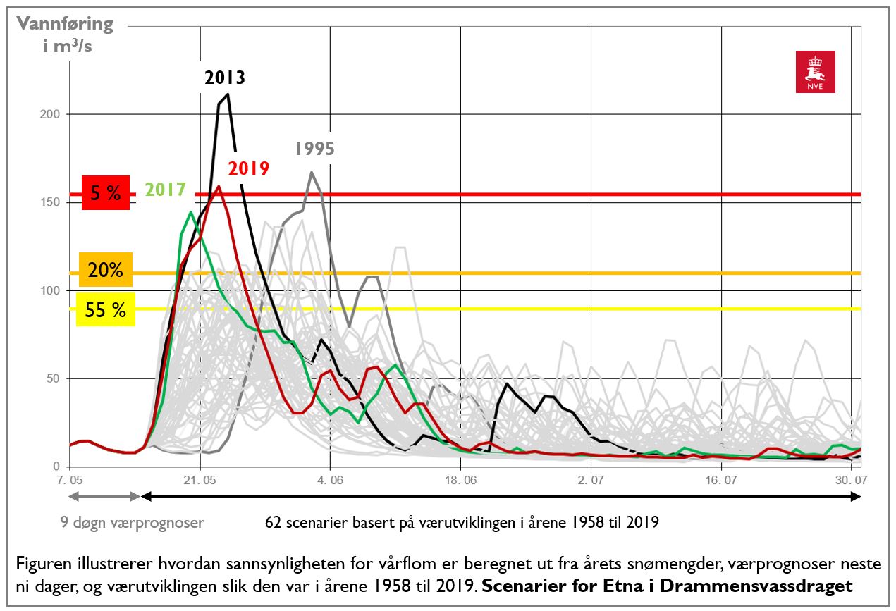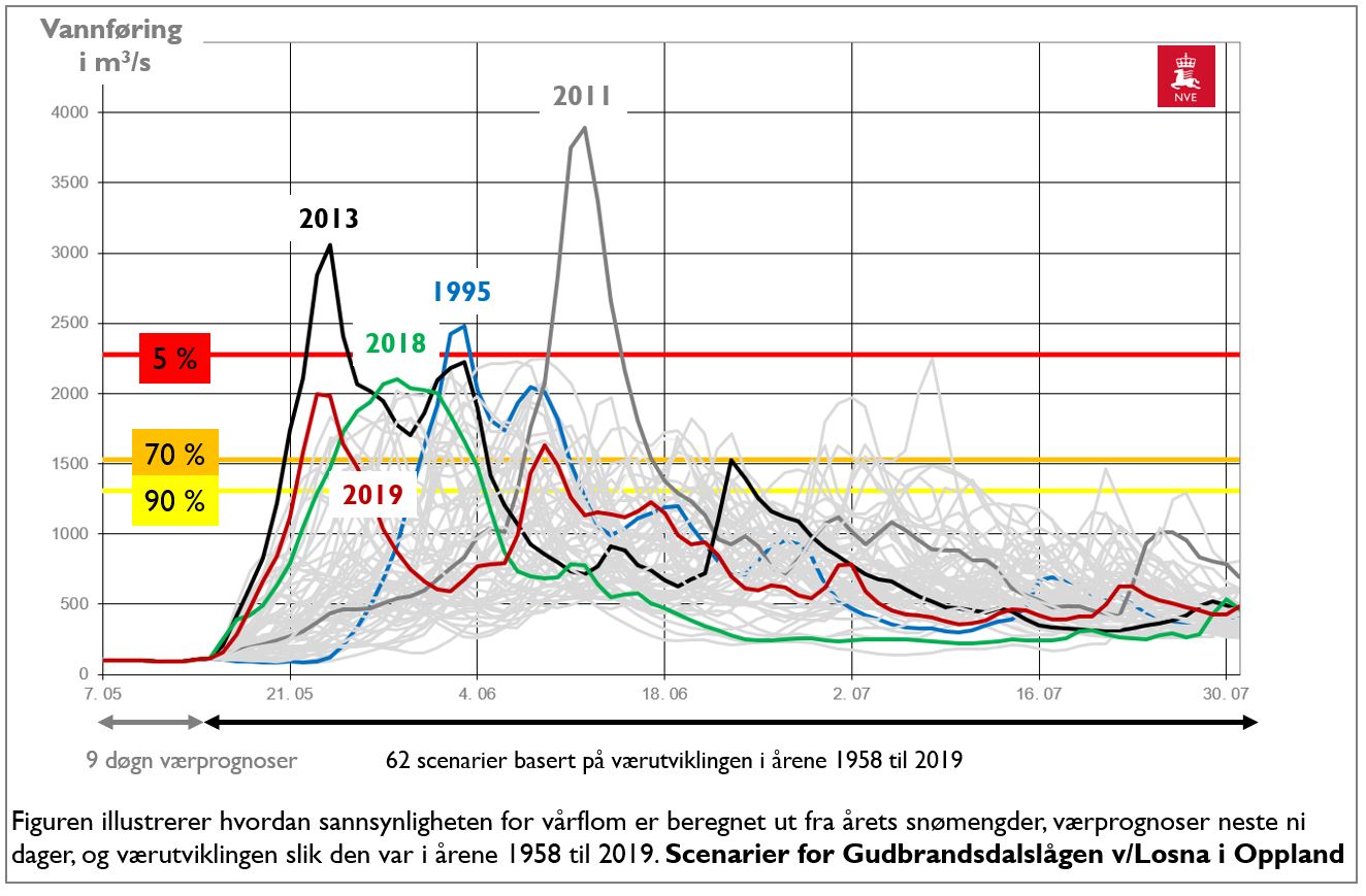 Figuren illustrerer hvordan sannsynligheten for stor vårflom er beregnet ut fra årets snømengder, værprognoser neste ni dager, og værutviklingen slik den var i årene 1958-2019.