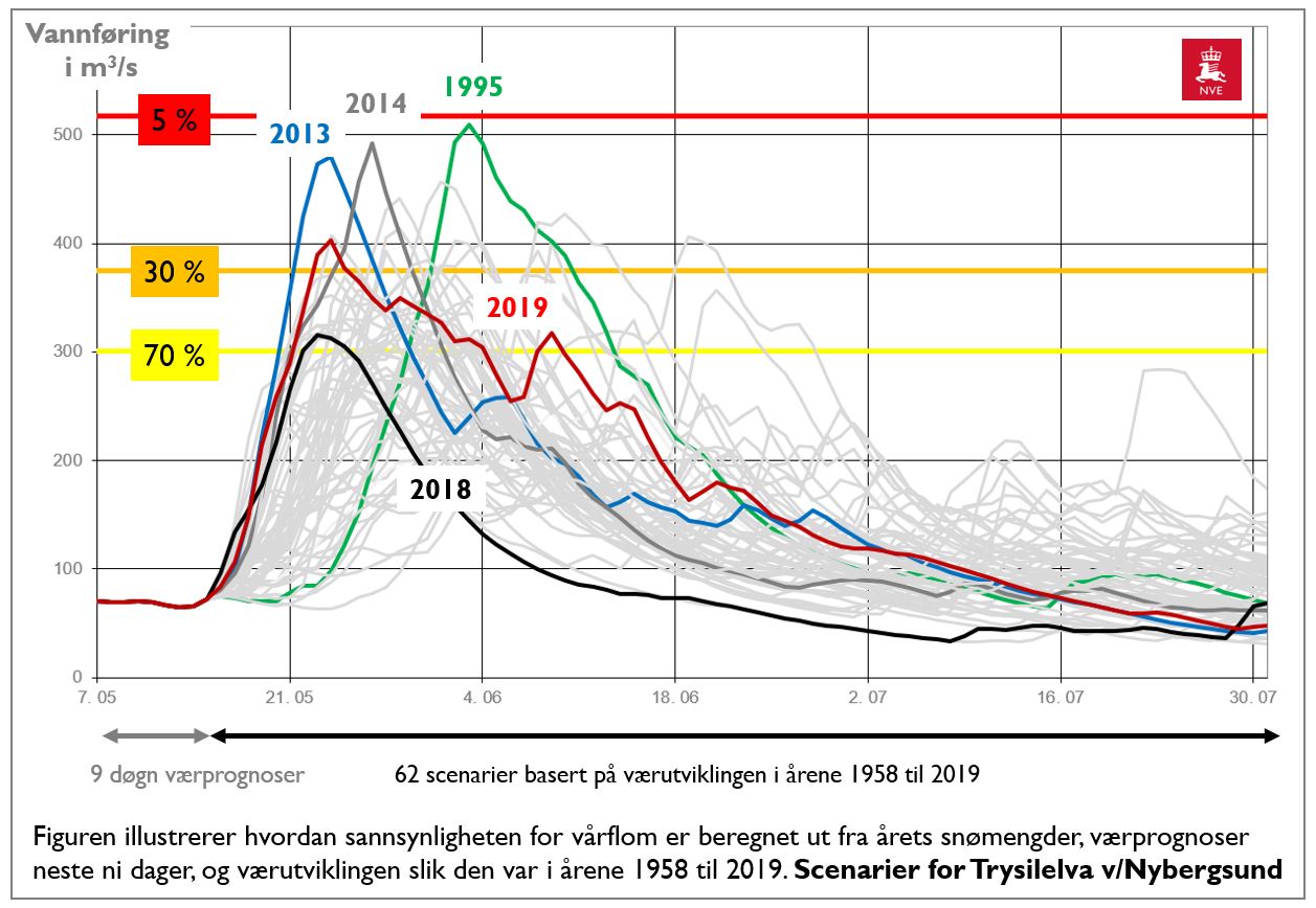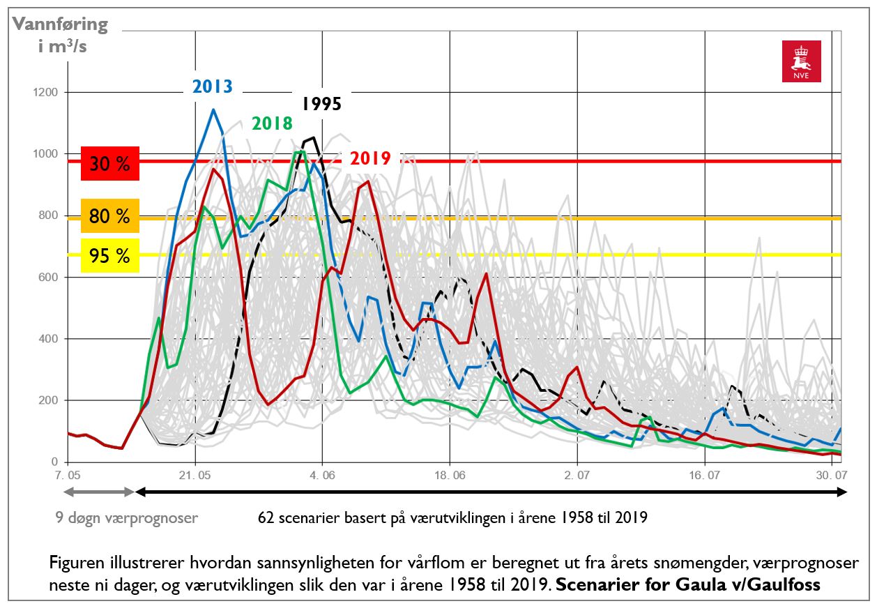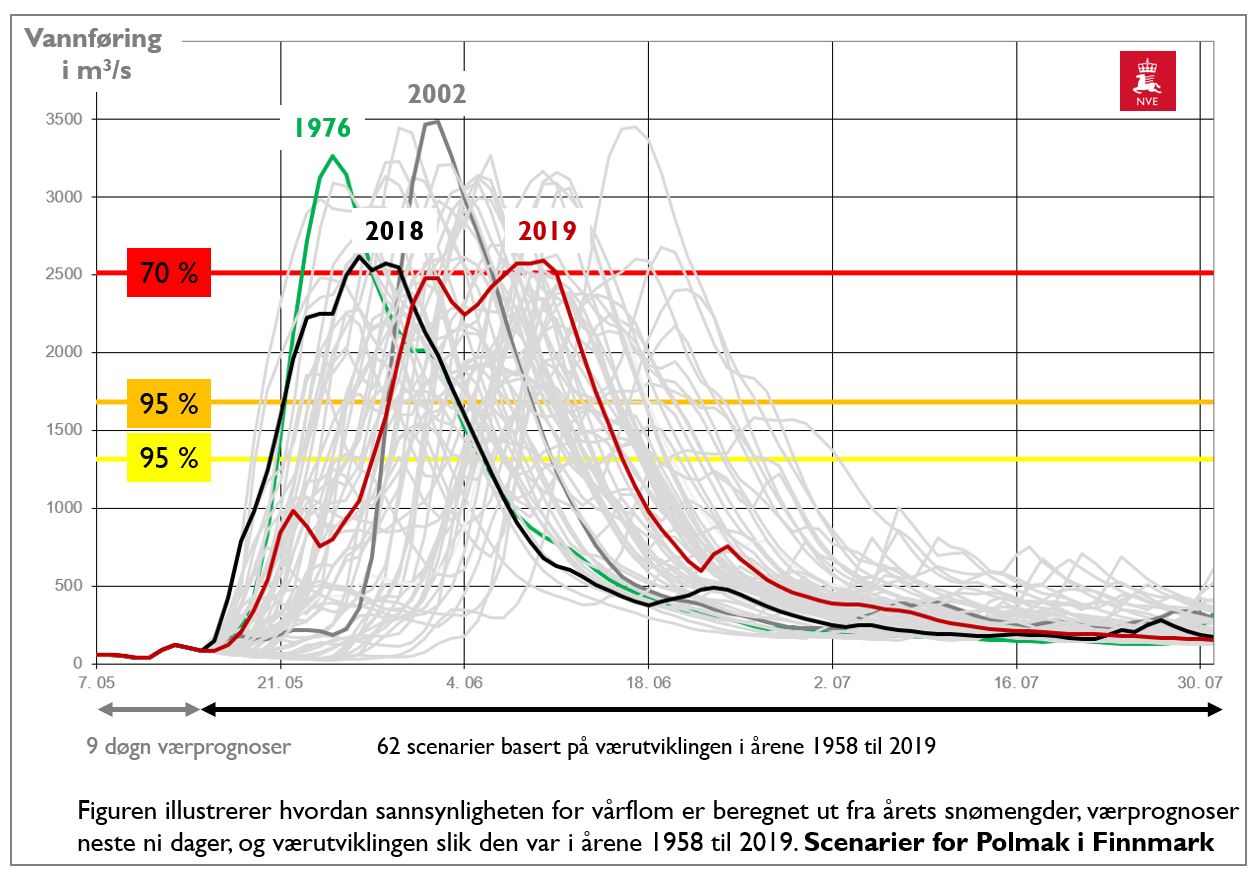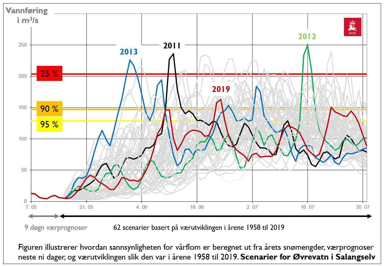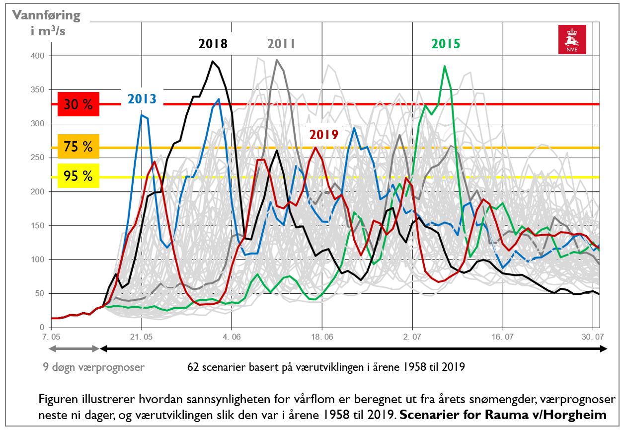 Figuren illustrerer hvordan sannsynligheten for stor vårflom er beregnet ut fra årets snømengder, værprognoser neste ni dager, og værutviklingen slik den var i årene 1958-2019.