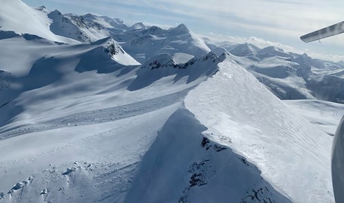 Vær obs på at det mange steder i hele landet ligger uvanlig store skavler. Dette bildet viser store toppskavler mellom Trolltind og Åbittind (Romsdalen/Trollheimen), men er gjeldende for mange steder i landet. Dette skavlbruddet har ført til et stort skred i snøen nedenfor. Hold god avstand til skavler. Foto: Arnfinn/Forsvaret/Regobs, 7. april 2020.