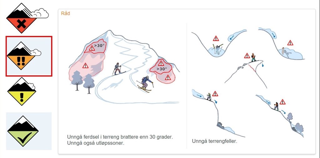 Sjekk alltid snøskredvarslene på varsom.no før du går på tur, bruk abonnementsløsningen for å få varsel om oppdaterte snøskredvarsler og andre naturfarer på SMS og e-post, og bruk Varsom Regobs-appen til å se hvor det det er skredterreng.