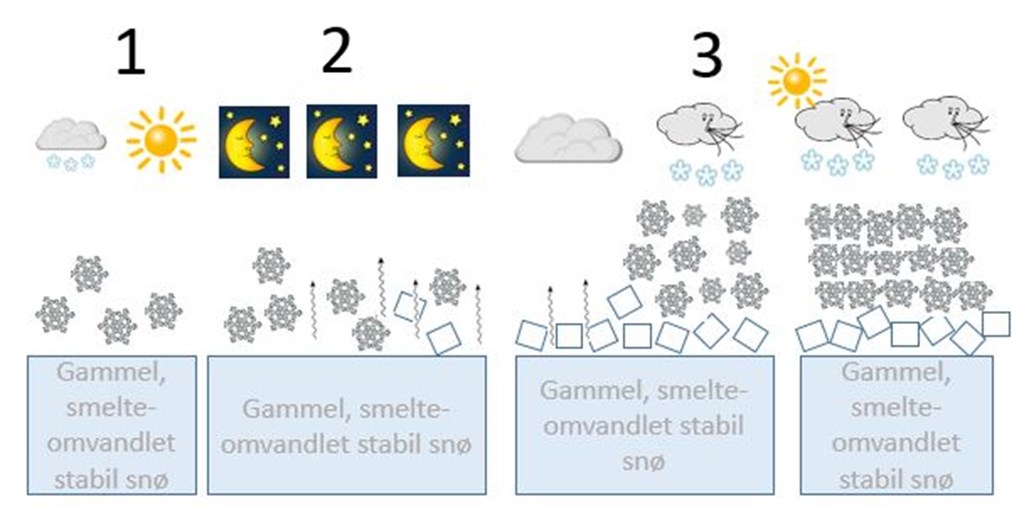- Fredag kommer det igjen nysnø som gir nytt godt skiføre. Nysnøen kommer imidlertid sammen med nok vind til at det legger seg myke flak av nysnø over kantkornet. Nå har vi oppskriften på et snødekke hvor skred kan være lett å løse ut siden nysnøflakene har lagt seg på det laget som har blitt til et svakt lag av kantkorn de siste dagene.