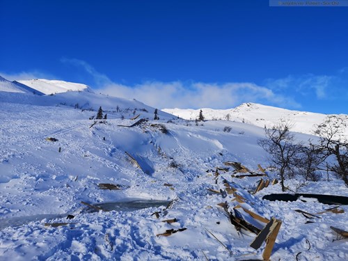 Politiet i Sør-Øst har lagt inn dette bildet fra 19 februar. En hytte ble ødelagt i skredet. Foto: Regobs.no / Politiet i Sør-Øst