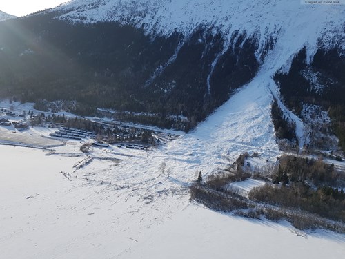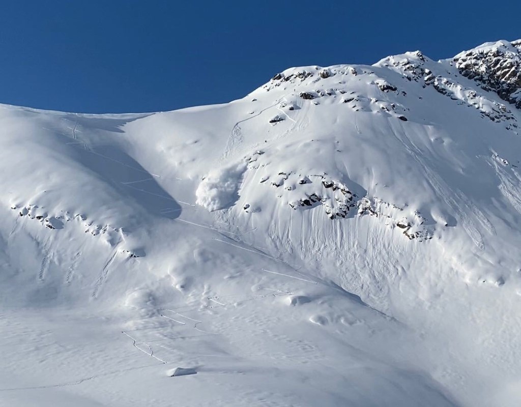 25. februar la Statens Vegvesen inn dette bildet. Det svært store skredet anslås til å være 400m bredt i toppen, og bruddkanten var på hele 2 meter. Foto: Regobs.no / Jens@SVV