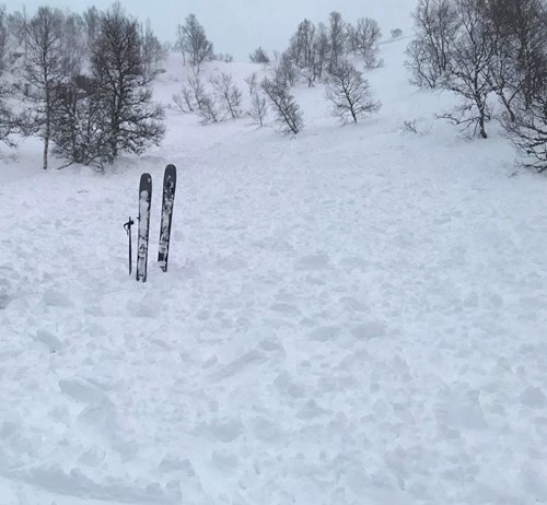 Noen ganger går det nesten galt. Denne gangen gikk det fint, men når det registreres i Regobs så kan redningstjenesten vite at det ikke ligger noen begravet i snøen. Foto: Regobs.no / petter@norskluftambulanse