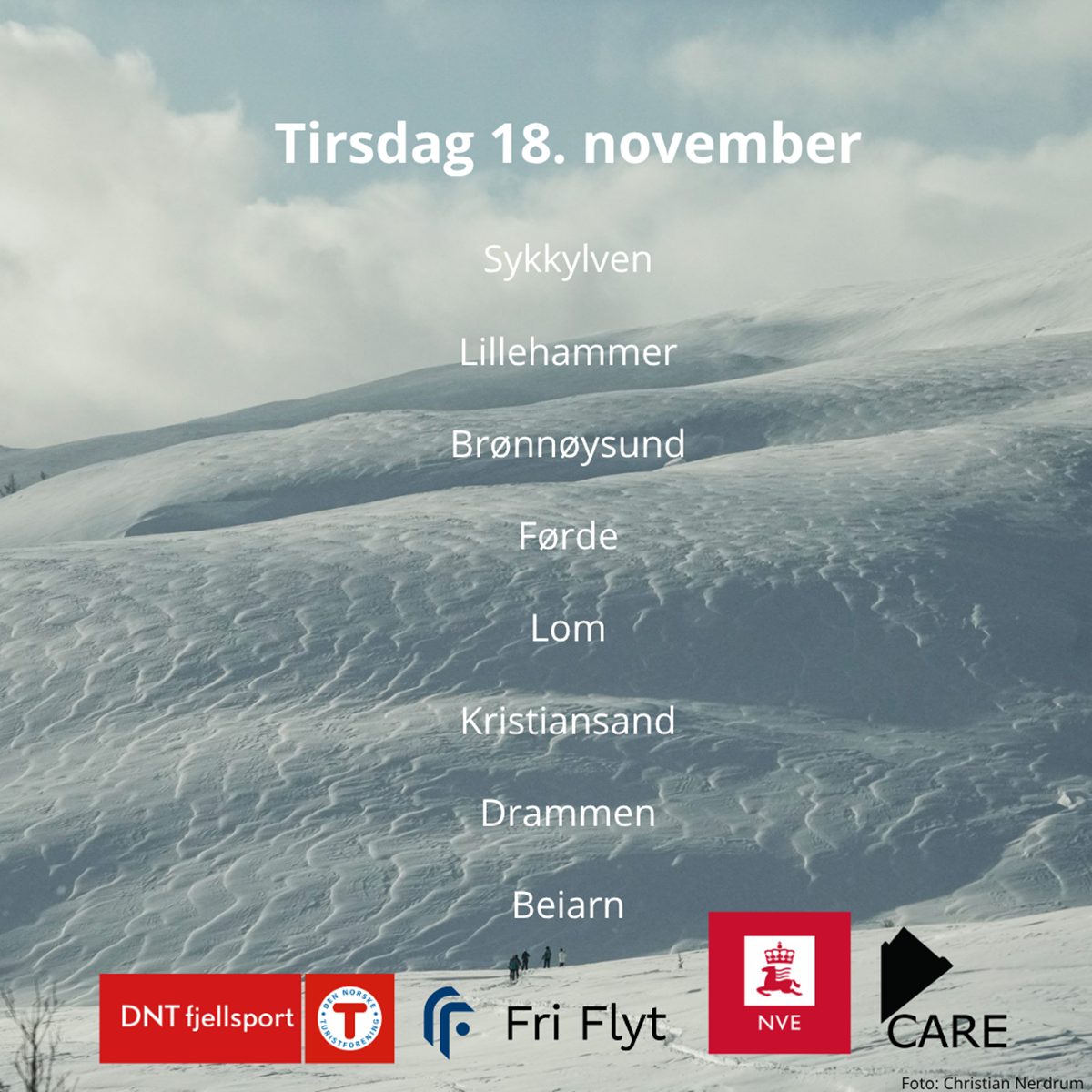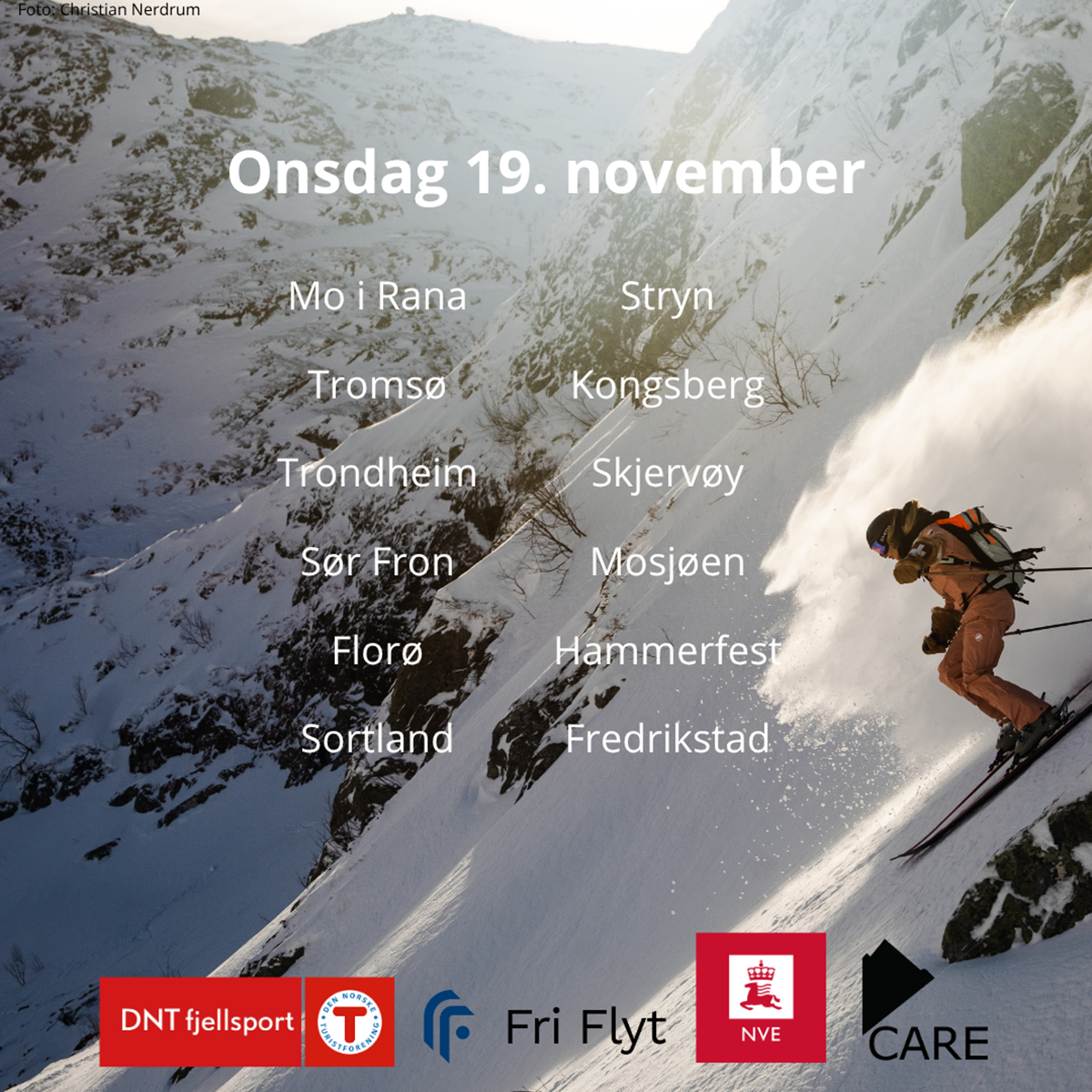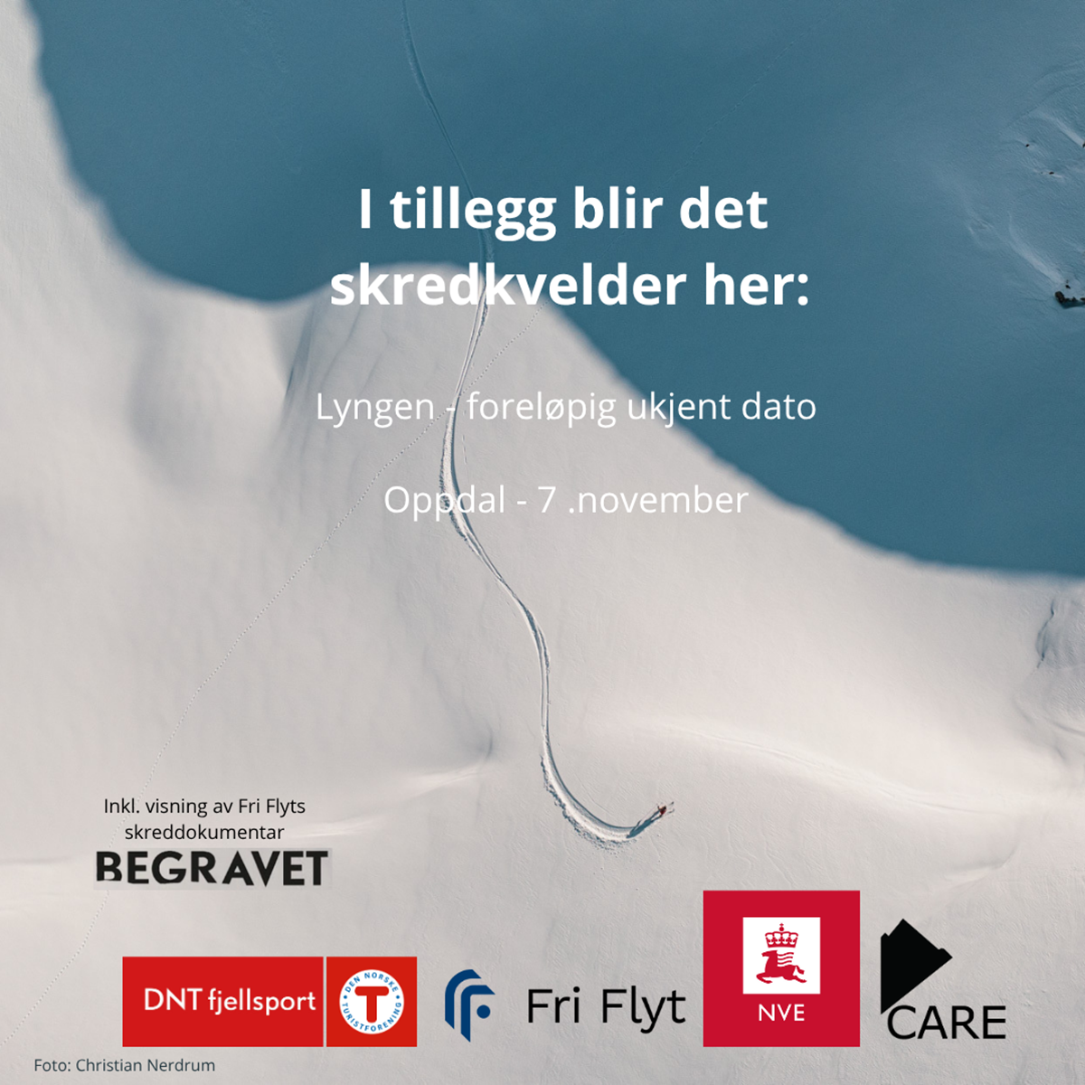 For fjerde år på rad arrangerer NVE v/ Snøskredvarslingen / Varsom, DNT, CARE og Fri Flyt skredkvelder over hele landet. Skredkveldene skal gi folk som ferdes i fjellet livsviktig kunnskap om snø og snøskredfare slik at de kan ta gode, trygge valg når de er på tur.