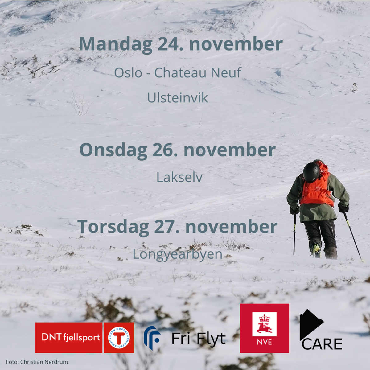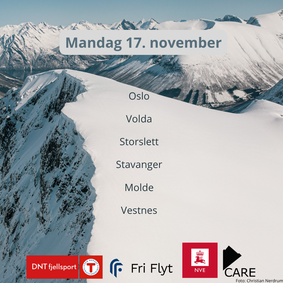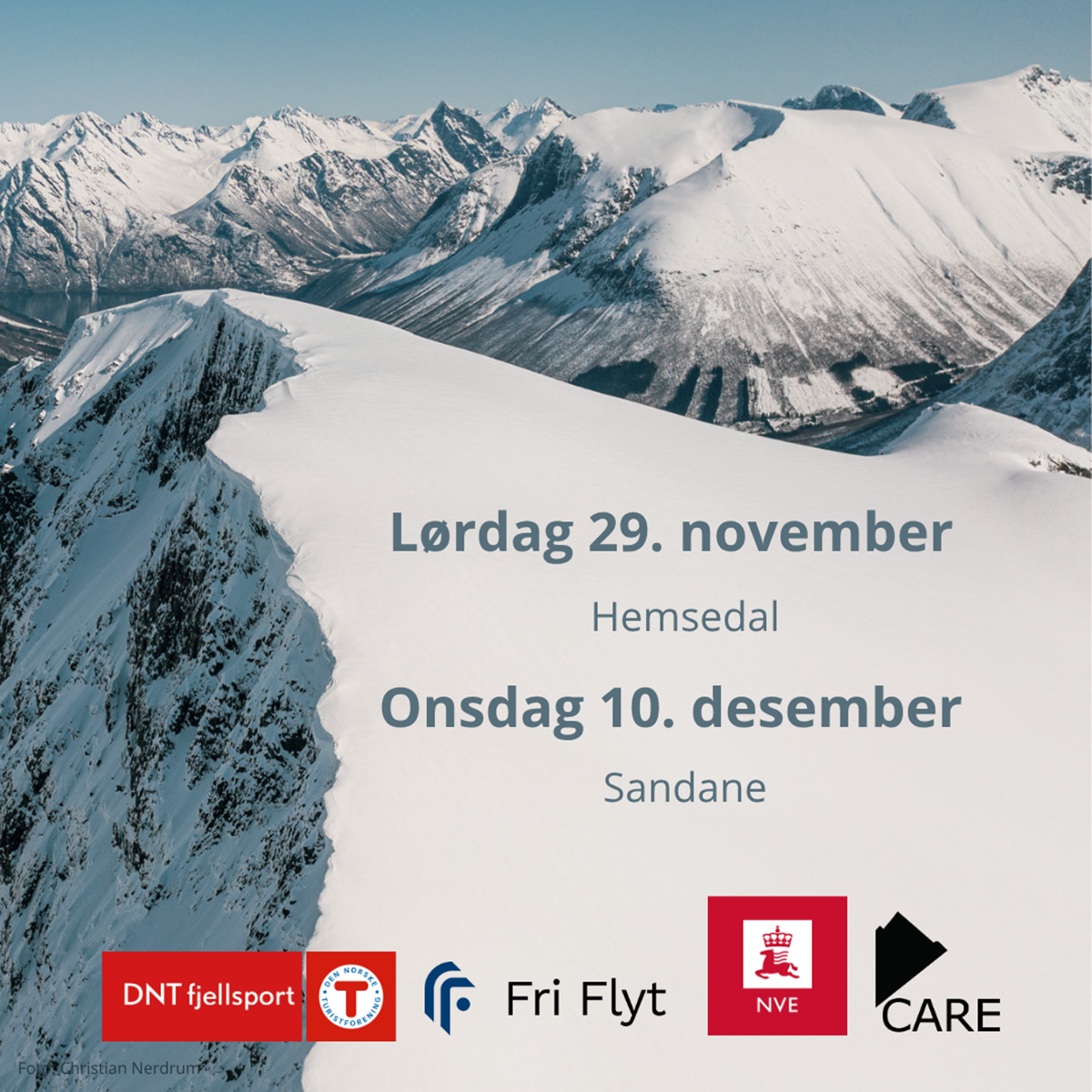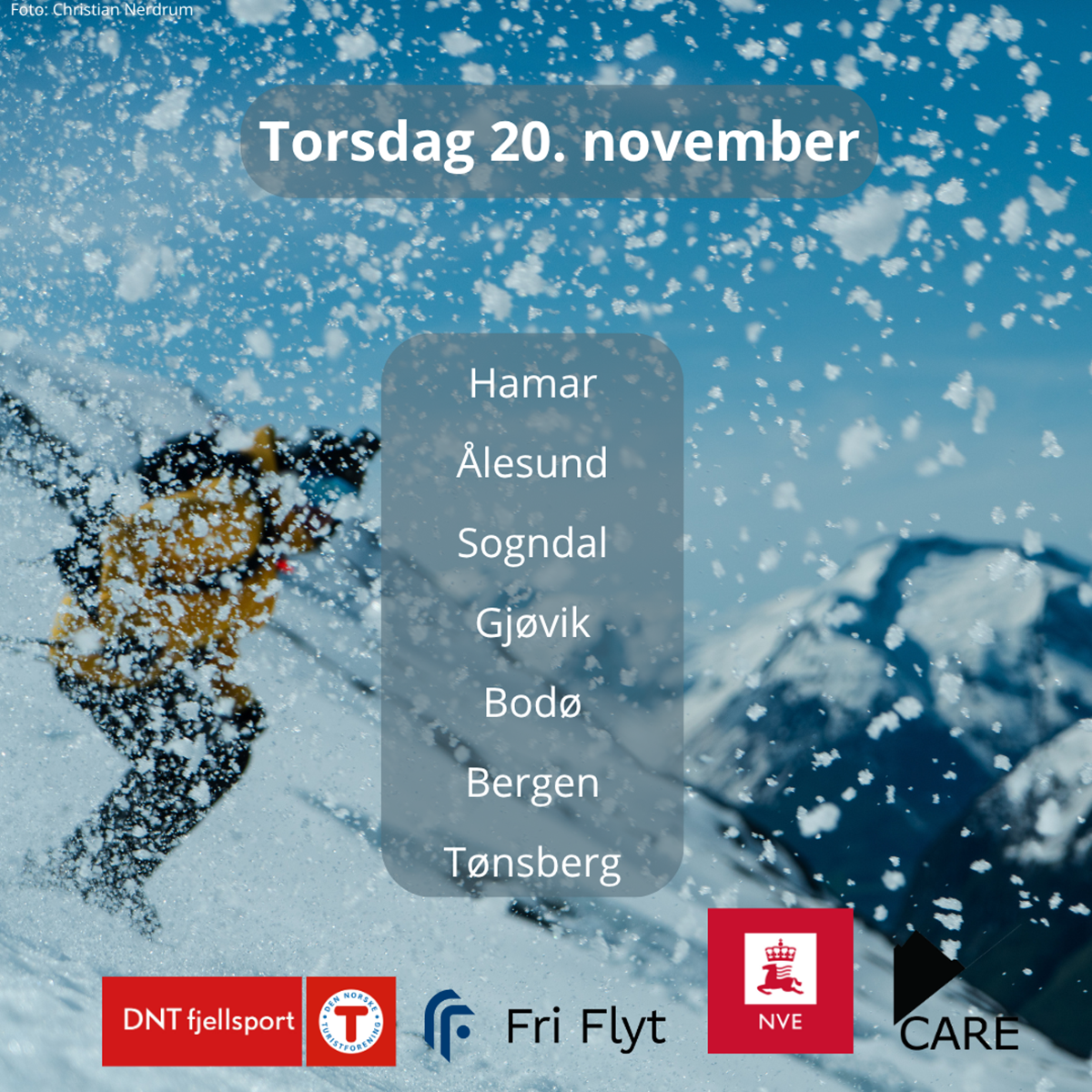 For fjerde år på rad arrangerer NVE v/ Snøskredvarslingen / Varsom, DNT, CARE og Fri Flyt skredkvelder over hele landet. Skredkveldene skal gi folk som ferdes i fjellet livsviktig kunnskap om snø og snøskredfare slik at de kan ta gode, trygge valg når de er på tur.
