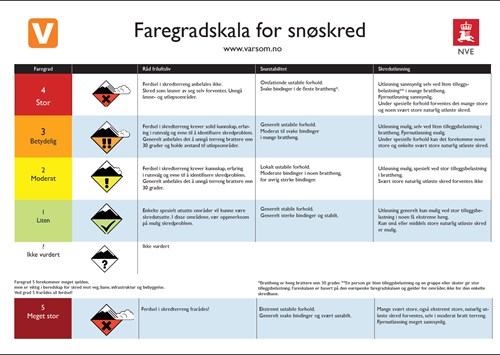 Her finner du faregradskalaen for snøskred. Den forklarer alle fem faregraden som vises.
