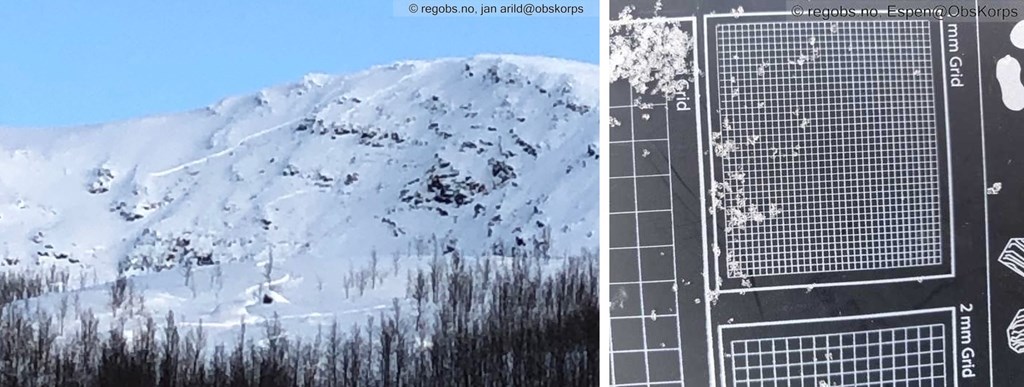 Bilde: t.v: Et stort snøskred (str3) ble fjernutløst på lang avstand i Kåfjord torsdag. Det ligger vedvarende svake lag av kantkorn i snødekket i nord. Foto: Foto: Jan Arild/regobs og espen/regobs