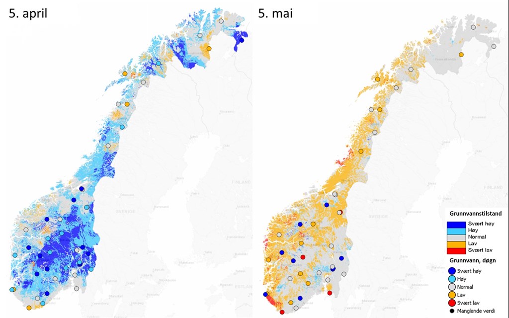 Grunnvannstanden er lav langs kysten og i lavereliggende strøk, men stort sett normal i indre strøk. Et værskifte med mer vinterlige værforhold i løpet av april har ført til en nedgang i grunnvannstanden i store deler av landet. De neste ukene forventes mildvær som trolig vil bedre situasjonen.