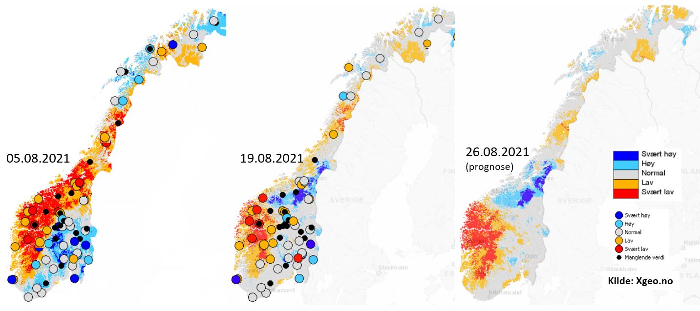 Figur: Kart over beregnet og målt (sirkler) grunnvannstand, hhv. 05. august, 19. august og 26. august (prognose). Verdier er i forhold til gjennomsnittlig grunnvannstand for samme dato i referanseperioden 1981-2010. Grunnvannstanden er simulert ved bruk av en hydrologisk modell (HBV). Sirklene viser observert døgnmiddelverdi for grunnvannstand. Kilde: senorge.no