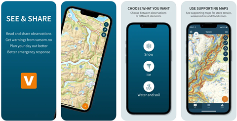 - Bli kjent med appen - lær deg å bytte mellom tema snø, jord, vann og is. Se observasjoner og kart for bratthet, utløp, flomsoner, svekket is og topografi