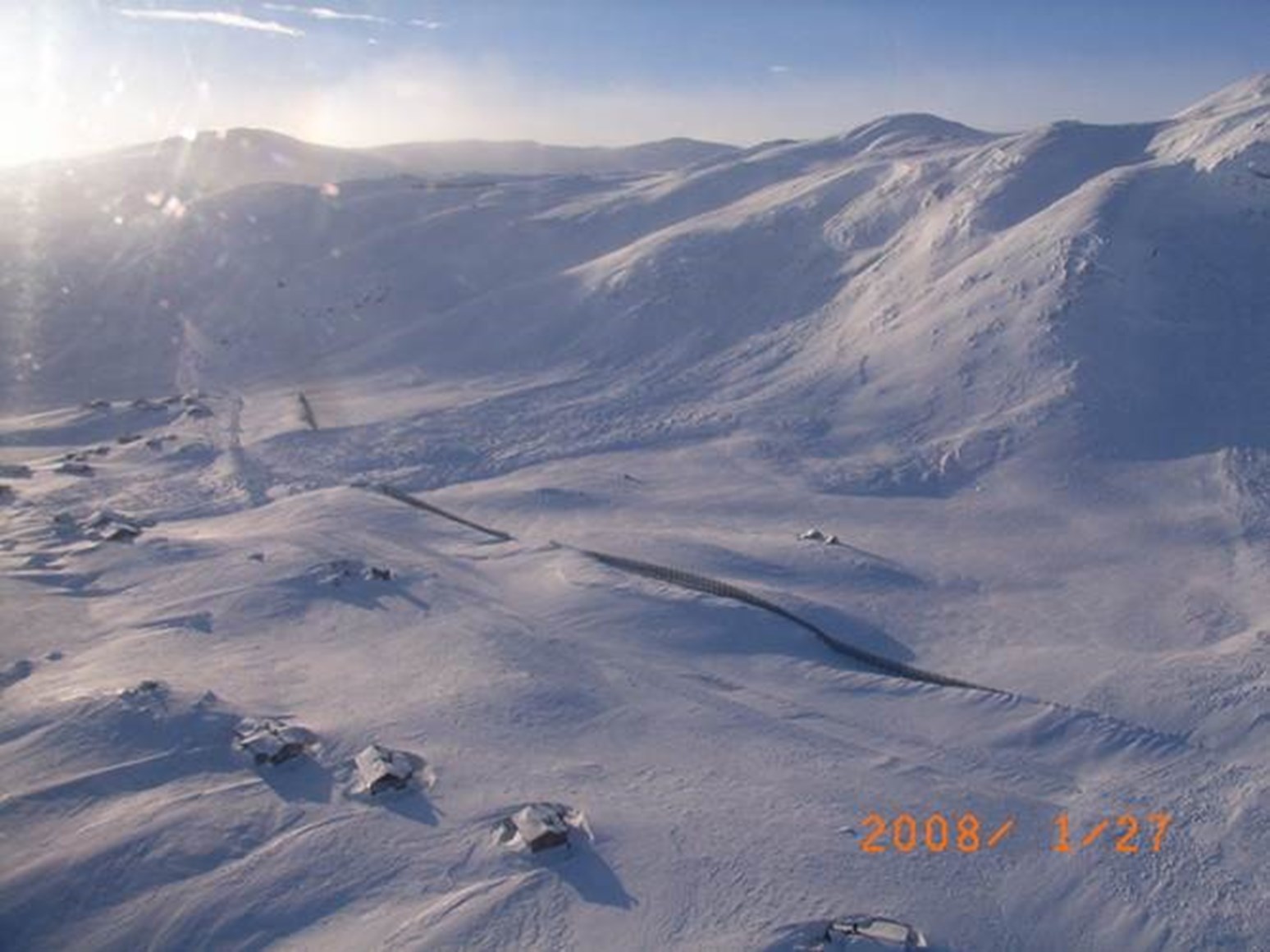 Dette skredet gjekk over veg og inn i hyttefeltet. Utløpslengda var vesentleg lengre enn det ein skal forvente med ei konservativ 1:3 vurdering (at skredet går 3 ganger så langt som høgda på fjellsida). Utløpslengda tilsvarar str. 5, men volumet av skredmassane er ikkje så store. Biletet er teke ved Tyin i Jotunheimen.